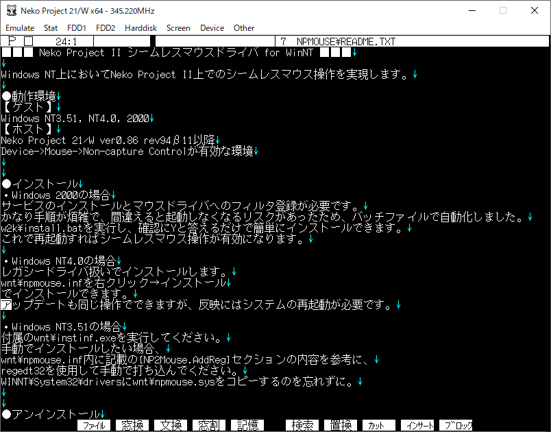 Neko Project 21/W ver0.86 rev101β3が公開されました。 ----------------------------------------------------------- Neko Project 21/W ver0.86 rev101β3を公開しました。 ・WABなしで縦480pxを超える表示や80桁を超える表示に対応 ・30行BIOSの50行モードや90桁BIOSを使用できます ・80桁を超えの可否は設定でON/OFF出来ます SimKさんのパッチVZ画像 ----------------------------------------------------------- NP2でVZ大画面表示は長年の夢だったので、早速試してみました。 CONFIG.SYS DEVICE=\UT\90hook.sys ※できるだけ上の方に置く SHELL=\COMMAND.COM /P /E:4000 AUTOEXEC.BAT 30bios -A1040 90bios -X80,128 -MULTI -5 ※この指定は必須 128.bat 90bios -D126,31 ※ 桁,行 の指定 ※ VRAMサイズは4000までで、80*50(4000) 100*40(4000) 128*31(3968)などとする でやってみたのですが、なぜかうちの環境では画面が 88桁以上にできませんでした。 なのでとりあえず、88桁*40行ではできました。嬉しい!